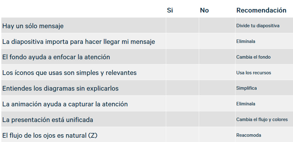 Cuando acabes de preparar tu presentación esto te puede ayudar a revisar tus diapositivas: